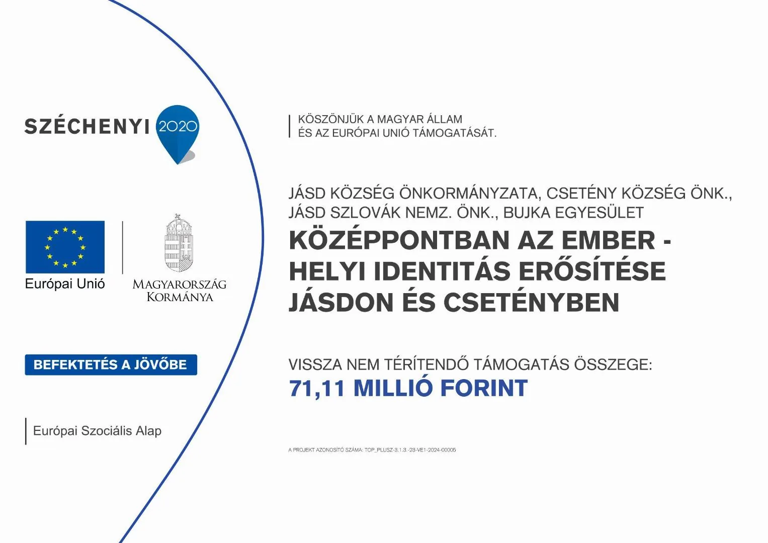 Az Európai unió finanszírozásával megvalósulhat a TOP_PLUSZ-3.1.3-23-VE1-2024-00005 , Középpontban az ember – helyi identitás erősítése Jásdon és Csetényben című pályázatunk 71.112.200,- Ft értékben, melyen támogatás nyertek a konzorcium tagjai: